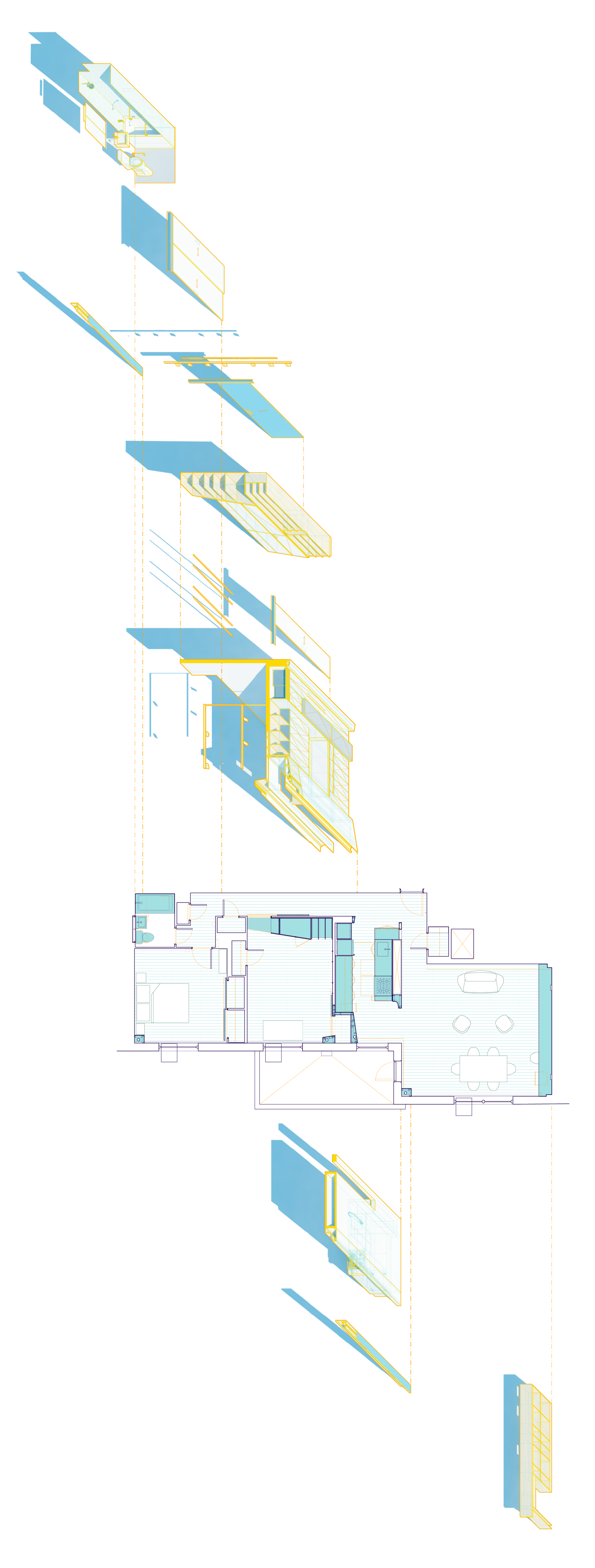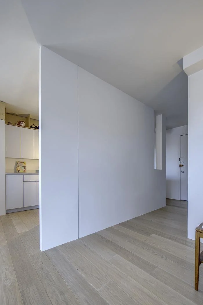 At the kitchen’s south wall, an existing chase carrying gas, water, electricity, and the building intercom system blocked daylight, yet could not be moved. The “Big Wall” was sculpted around these obstacles, creating an opening adjacent to the intercom unit, and adding a slim cap to the Wall’s western edge.