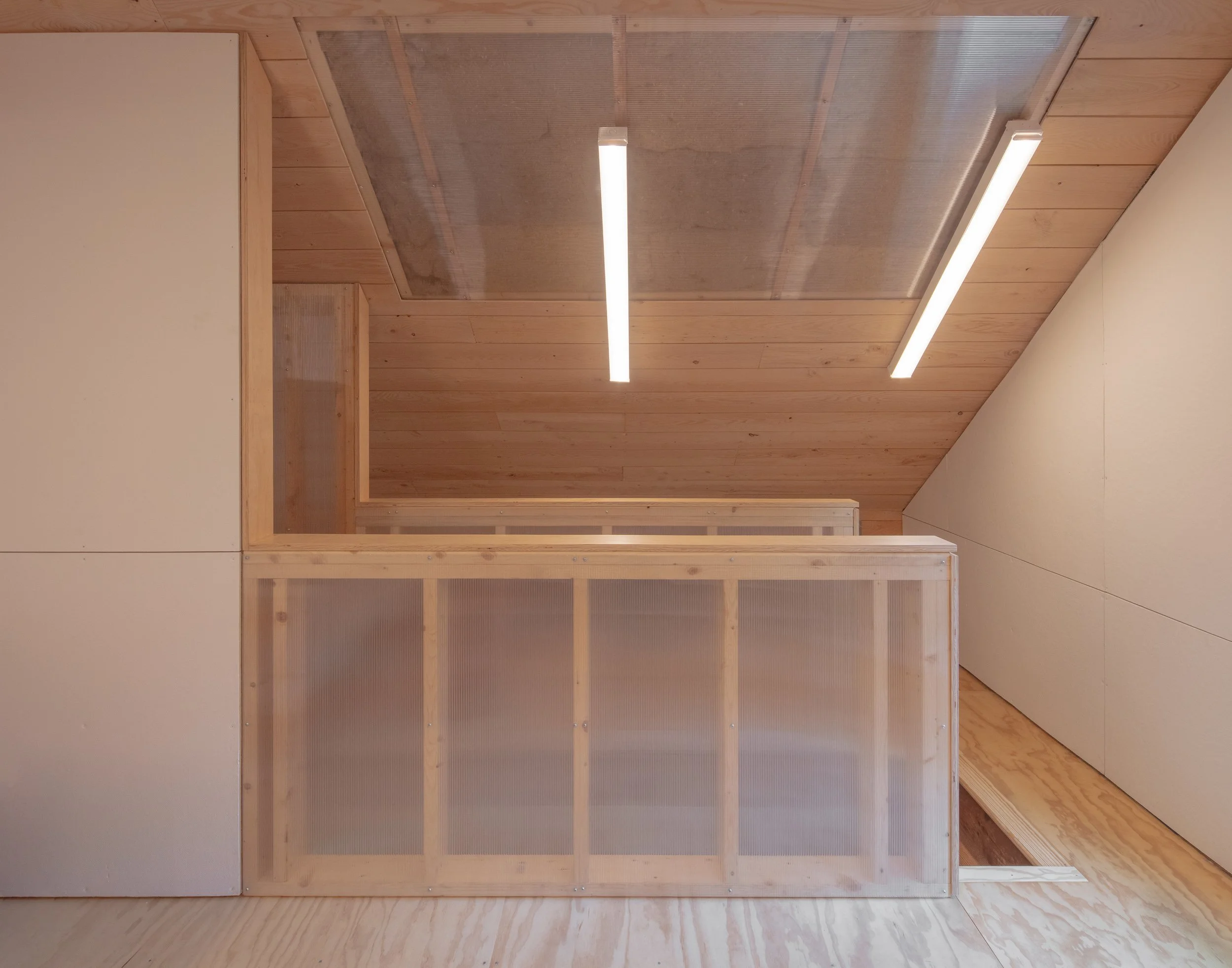 Here, we used translucent polycarbonate panels to scatter daylight softly across surfaces, creating a luminous interior that supports artistic work without harsh shadows. In one location, a polycarbonate-clad stair doubles as both a guardrail and a light filter, allowing the artist to still have visibility to the entry of the studio from their office on the other side. In another, the panels reveal the hemp insulation behind them—a reminder that even materials typically hidden in walls can play an expressive role in design.