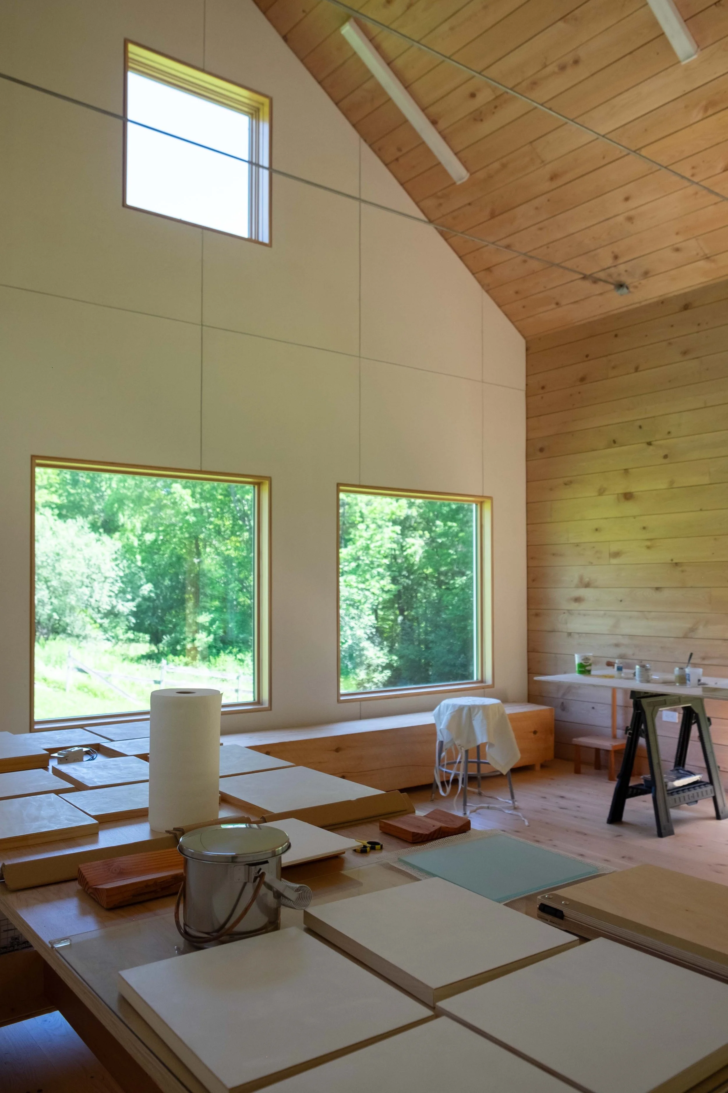 While Barnard Barn is an artist’s studio, its palette points to broader applications. Homasote panels, polycarbonate glazing, and plywood interiors are strategies we’re actively exploring in residential contexts—where low-carbon, cost-effective finishes can support more resilient and inspiring homes.
