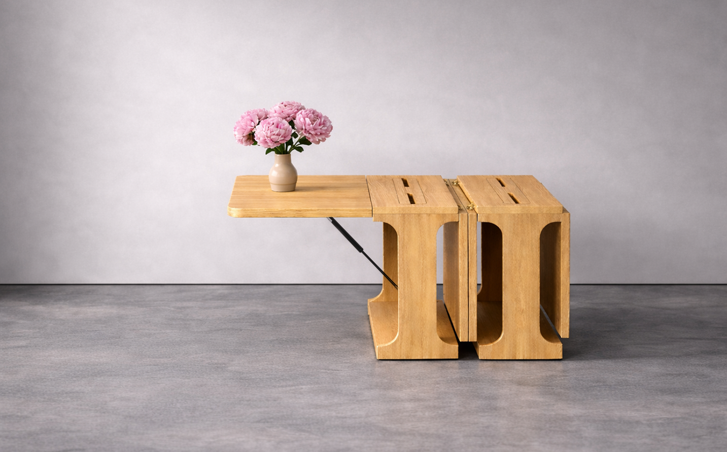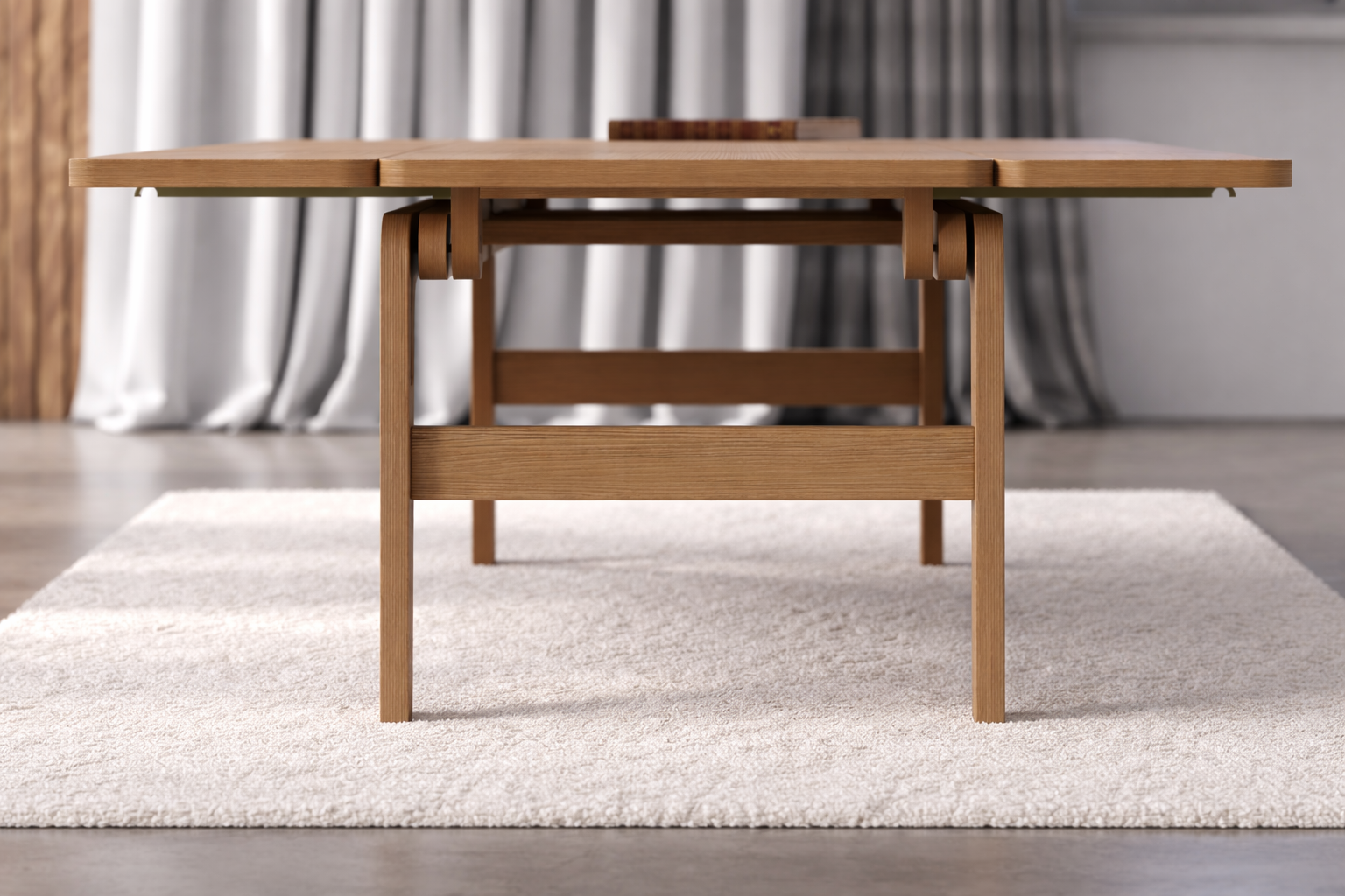 During the creation of these prototypes, what we often refer to as a “happy accident” can occur: a functional outcome that only reveals itself through the act of making and testing. In this case, a third mode emerged. When the table remains at its lower height but is folded outward, it becomes an extra-large coffee table—one that comfortably occupies and anchors a more spacious living room.